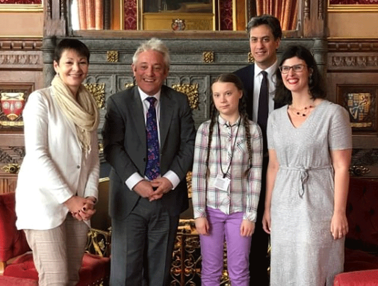 Η 16χρονη ακτιβίστρια συμμετείχε σε στρογγυλή τράπεζα με τον ηγέτη του Εργατικού κόμματος, Τζέρεμι Κόρμπιν, των Φιλελεύθερων Δημοκρατών Βινς Κέιμπλ, των Πρασίνω, Κάρολιν Λούκας, όπως και με τους επικεφαλής του Εθνικού Κόμματος Σκοτίας και του ουαλικού Plaid στο βρετανικό κοινοβούλιο Ίαν Μπλάκφορντ και Λιζ Ρόμπερτς. Στην συνάντηση δεν συμμετείχε η πρωθυπουργός Τερέζα Μέι, ενώ νωρίτερα συναντήθηκε και με τον πρόεδρο του κοινοβουλίου Τζον Μπέρκοου.