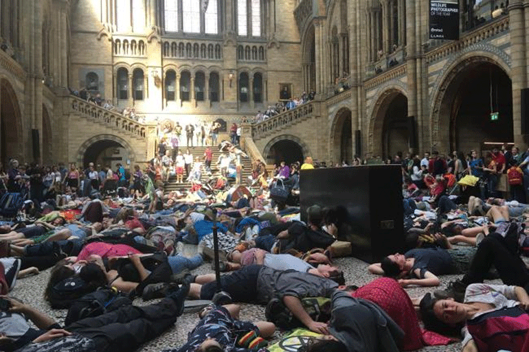 Δεκάδες άνθρωποι ξαπλωμένοι στο πάτωμα, υποδυόμενοι τους νεκρούς, κάτω από τον σκελετό μιας φάλαινας: η οργάνωση Extinction Rebellion οργάνωσε σήμερα μια διαμαρτυρία die-in στο μουσείο Φυσικής Ιστορίας του Λονδίνου, αφού απέκλεισαν, την περασμένη εβδομάδα, πολυσύχναστα μέρη της πόλης για να κηρύξουν «μια οικολογική κατάσταση έκτακτης ανάγκης», ενώ κατήγγειλαν την κλιματική αδράνεια εκ μέρους των κυβερνώντων.