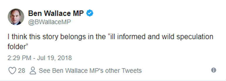 «Νομίζω πως η ιστορία αυτή ανήκει στην κατηγορία της παραπληροφόρησης και της άγριας σπέκουλας», έγραψε ο Μπεν Ουάλας στο Twitter, σχολιάζοντας την αναφορά του πρακτορείου ειδήσεων Press Association.