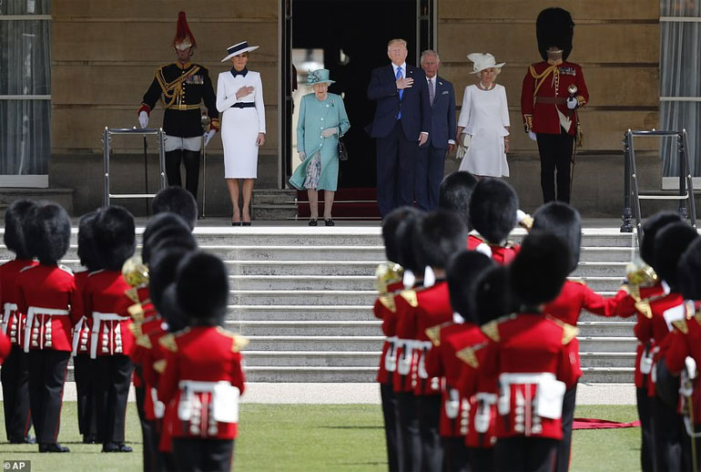 Ο Αμερικανός πρόεδρος στάθηκε στωικά δίπλα στη βασίλισσα Ελισάβετ στη δυτική βεράντα του παλατιού (Buckingham Palace) για να παρακολουθήσει την παρέλαση της βασιλικής φρουράς, ενώ τοποθέτησε το χέρι του πάνω από την καρδιά του κατά την ανάκρουση του εθνικού ύμνου. Στη συνέχεια επιθεώρησε το τιμητικό άγημα μαζί με τον πρίγκιπα Κάρολο, ενώ ακολούθησε υπάκουα τη βασίλισσα, μετά την ολοκλήρωση της τελετής υποδοχής.