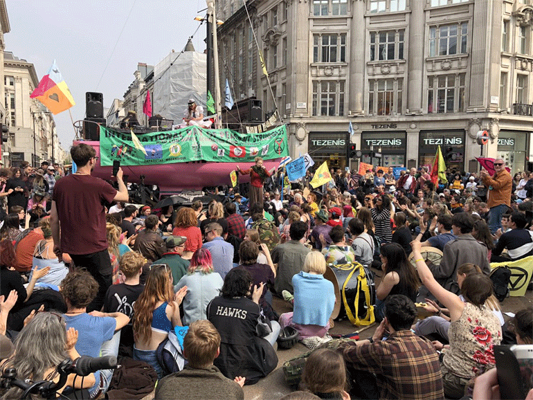 Μέλη της ομάδας Extinction Rebellion έχουν κινητοποιηθεί από τις αρχές της εβδομάδας, παρεμποδίζοντας την κυκλοφορία στο κέντρο του Λονδίνου, όπως στη Γέφυρα Γουότερλου, την Πάρλιαμεντ Σκουέρ και την Όξφορντ Σέρκους.