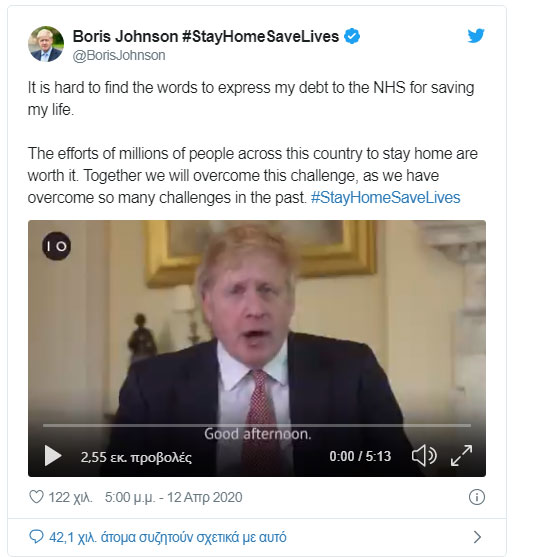 Στο πρώτο του μήνυμα προχώρησε ο Μπόρις Τζόνσον μετά την Εντατική. Ο Βρετανός πρωθυπουργός έγραψε σε ανάρτησή του στο Twitter: «Είναι δύσκολο να βρω τις λέξεις για να εκφράσω ό,τι χρωστάω στο προσωπικό του εθνικού συστήματος υγείας, που μου έσωσε τη ζωή».