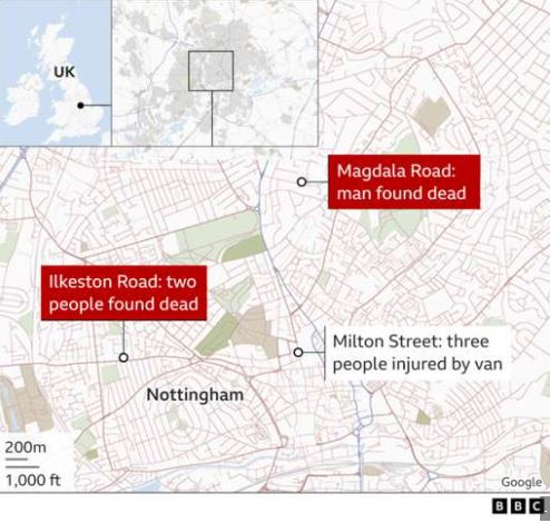 Οι πρώτες πληροφορίες ανέφεραν ότι δύο άνθρωποι βρέθηκαν νεκροί στην οδό Ilkeston στο κέντρο της πόλης λίγο μετά τις 4 τα ξημερώματα (03:00 GMT). Στη συνέχεια, οι αστυνομικοί κλήθηκαν σε άλλο περιστατικό στην Milton Street, όπου ένα βανάκι είχε προσπαθήσει να περάσει πάνω από τρία άτομα. Τα άτομα αυτά νοσηλεύονται στο νοσοκομείο. Επίσης, ένας άνδρας βρέθηκε νεκρός στην Magdala Road. Η αστυνομία του Νότιγχαμ θεωρεί ότι τα τρια περιστατικά συνδέονται μεταξύ τους.