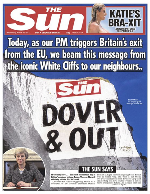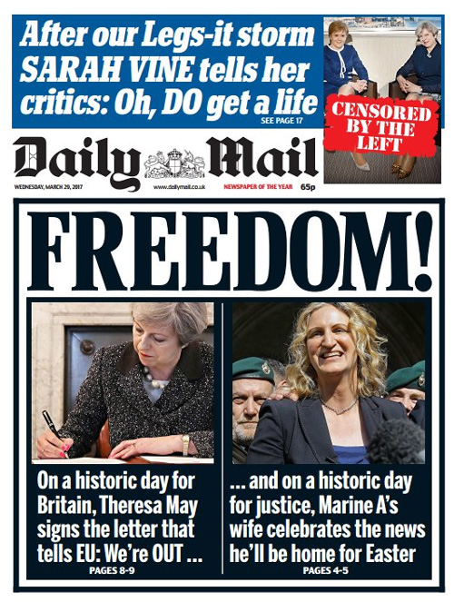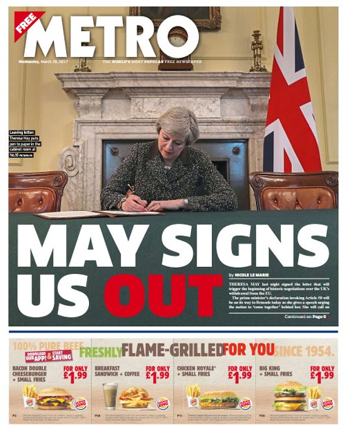 Tις δύο όψεις του νομίσματος για την έξοδο της Βρετανίας από το ευρωπαϊκό οικοδόμημα παρουσιάζει ο βρετανικός Τύπος με πρωτοσέλιδα άρθρα, στον απόηχο της υπογραφής από την Τερέζα Μέι της επιστολής που θα αποσταλεί στις Βρυξέλλες για το Brexit.