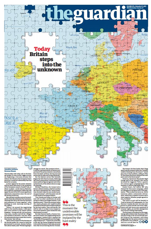 O «Guardian», ο οποίος παραδοσιακά υποστηρίζει τις απόψεις των Εργατικών στις οικονομικο-πολιτικές εξελίξεις, κυκλοφορεί με πρωτοσέλιδο που τιτλοφορείται «Σήμερα η Βρετανία προχωρά ένα βήμα προς το άγνωστο».