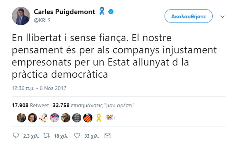 «Ελεύθερος και χωρίς εγγύηση» έγραψε σήμερα το πρωί ο Πουτζντεμόν σε μήνυμά του στα καταλανικά στο Twitter, που αποτελεί την πρώτη δήλωσή του, αφότου ενημερώθηκε χθες από τη βελγική Δικαιοσύνη για το ένταλμα σύλληψης που εκδόθηκε από τη Μαδρίτη.