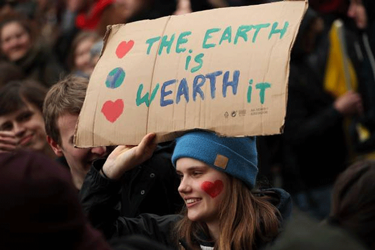 H πορεία τραγουδάει το διάσημο πια σύνθημα «είμαστε πιο θερμοί, πιο θερμοί από το κλίμα», ενώ τα πλακάτ που κρατάνε οι μαθητές είναι εκατοντάδες και το κάθε ένα γράφει ένα διαφορετικό μότο: «Εσείς θα πεθάνετε από γηρατειά. Εγώ δε θα έχω αυτήν την ευκαιρία». «Ας κάνουμε τη γη και πάλι ισχυρή» (κατά το σύνθημα του Ντόναλντ Τραμπ «make America great again». «Δεν υπάρχει πλανήτης Β».