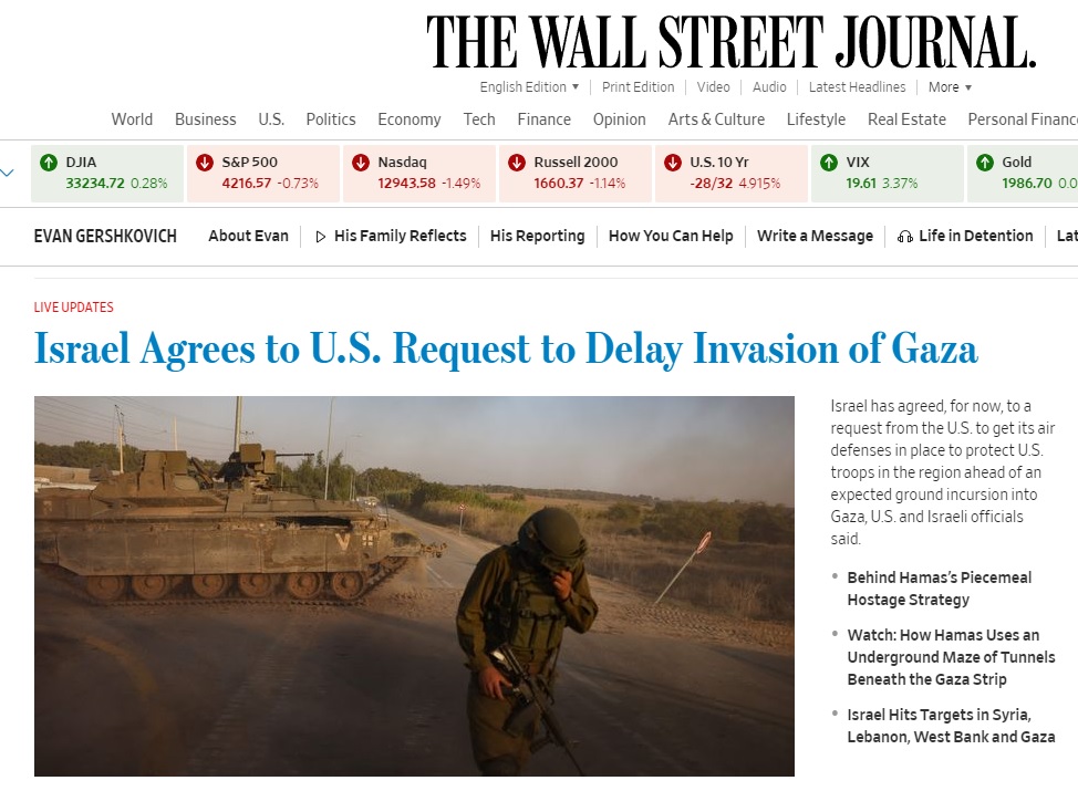 Το Ισραήλ συμφώνησε να καθυστερήσει προς το παρόν τη χερσαία επιχείρησή του στη Λωρίδα της Γάζας, ούτως ώστε οι Ηνωμένες Πολιτείες να έχουν τον χρόνο για να στείλουν αντιπυραυλικά συστήματα στην περιοχή, αναφέρει η εφημερίδα Wall Strett Journal, επικαλούμενη Αμερικανούς και Ισραηλινούς αξιωματούχους.