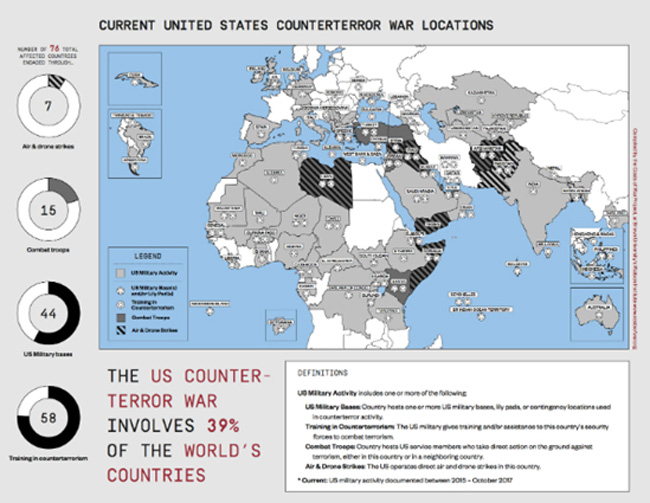 Αυτό σημαίνει πως χώρες όπως το Αφγανιστάν, η Συρία, το Ιράκ, η Υεμένη, η Σομαλία και η Λιβύη εξακολουθούν να αποτελούν τον άμεσο στόχο των αμερικανικών και συμμαχικών τους αεροπορικών επιδρομών. Ο πόλεμος αυτός τραγανίζει τα χρήματα των Αμερικανών φορολογουμένων, οι οποίοι ωστόσο δεν δείχνουν να διαμαρτύρονται για αυτό. Άλλωστε, το βιομηχανικό-πολεμικό σύμπλεγμα έχει πολλαπλές διασυνδέσεις στα ΜΜΕ, ώστε να δικαιολογούνται όλα.