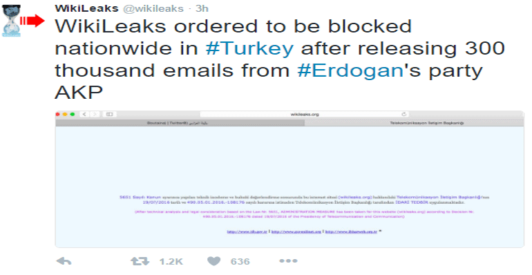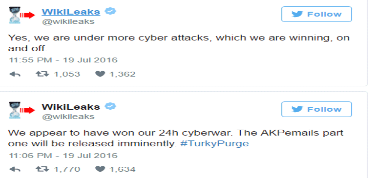 Την Τρίτη, ο ιστότοπος της Wikileaks, ανακοίνωσε στο Twitter ότι δέχτηκε διαδικτυακή επίθεση. Ωστόσο, παρά τον «κυβερνοπόλεμο», κατάφερε να δώσει στη δημοσιότητα εκατοντάδες χιλιάδες ντοκουμέντα που σχετίζονται με το κόμμα «Δικαιοσύνης και Ανάπτυξης» (ΑΚΡ) του προέδρου της Τουρκίας.