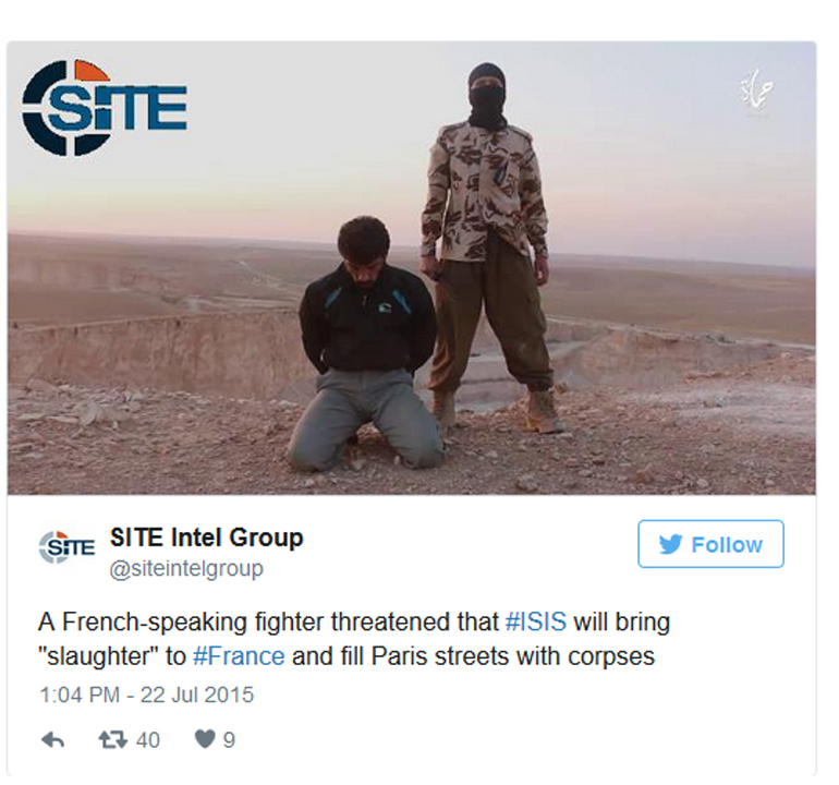 «Έχετε πάρει εντολή να πολεμήσετε τους άπιστους όπου τους βρίσκετε, τι περιμένετε λοιπόν; Υπάρχουν όπλα και αυτοκίνητα που είναι διαθέσιμα και στόχοι που μπορούν να πληγούν», δηλώνει ένας μαχητής του Χαλιφάτου στο βίντεο αυτό, ενώ βρίσκεται περιτριγυρισμένος από άλλους μαχητές.