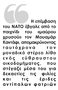 Η επέμβαση του ΝΑΤΟ έβγαλε από το παιχνίδι του «μαύρου χρυσού» τον Μουαμάρ Καντάφι, απομακρύνοντας ταυτόχρονα τον μοναδικό στέρεο λίθο ενός εύθραυστου οικοδομήματος, που στέγαζε μέσα του για δεκαετίες τις φιλίες και τις έριδες αντίπαλων φατριών. Δεκάδες φύλαρχοι έκλεισαν την «πόρτα» στη μεταβατική κυβέρνηση και όρισαν τη δική τους σφαίρα επιρροής, την οποία και συνεχίζουν να προασπίζονται με τη δύναμη των όπλων.