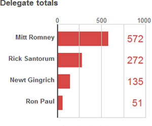 Mέχρι στιγμής ο πρώην κυβερνήτης της Μασαχουσέτης έρχεται πρώτος σε εκλέκτορες, έχοντας συγκεντρώσει 572. Ο… «μαγικός» αριθμός είναι 1.144 καθώς εφόσον καταφέρει να «πιάσει» το συγκεκριμένο νούμερο τότε μπορεί να εκλεγεί χωρίς να χρειάζεται τη συναίνεση των αντιπάλων του. Ο Rick Santorum έχει 272, ο Newt Ginrgich 135 και ο Ron Paul 51.