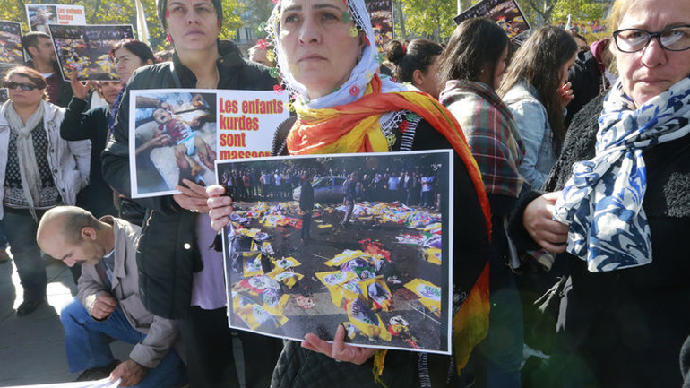Πολλές χιλιάδες άνθρωποι, στην πλειονότητά τους κουρδικής καταγωγής, διαδήλωσαν σήμερα στο Παρίσι, μία ημέρα μετά τις πολύνεκρες βομβιστικές επιθέσεις στην Άγκυρα, καταγγέλλοντας την «πολιτική του πολέμου» που ακολουθεί η τουρκική κυβέρνηση.