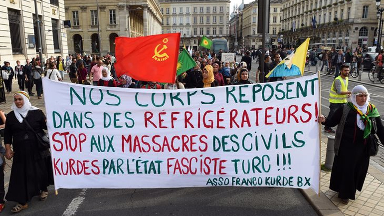 Ανάμεσα στο πλήθος ξεχώριζαν μια τεράστια κουρδική σημαία, λάβαρα διάφορων κουρδικών κινημάτων και μαύρα πλακάτ με συνθήματα όπως «Οι μάρτυρες της επανάστασης δεν πεθαίνουν ποτέ», «Ερντογάν δολοφόνος, Ευρώπη συνεργός» και «AKP + Νταές = επίθεση στην Άγκυρα», συνδυάζοντας τα αρχικά του Κόμματος Δικαιοσύνης και Ανάπτυξης του Ερντογάν με αυτά του Ισλαμικού Χαλιφάτου.
