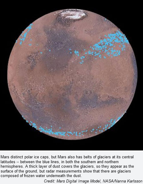 Οι ερευνητές του Ινστιτούτου Νιλς Μπορ του Πανεπιστημίου της Κοπεγχάγης, με επικεφαλής τη Νάνα Μπιόρνχολτ Κάρλσον, που έκαναν τη σχετική δημοσίευση στο περιοδικό γεωφυσικής “Geophysical Research Letters”, σύμφωνα με το πρακτορείο Ρόιτερς και το “Science”, ανέφεραν ότι οι «καμουφλαρισμένοι» παγετώνες καλύπτουν κυρίως δύο εκτεταμένες ζώνες, μία στο βόρειο και μία στο νότιο ημισφαίριο του «κόκκινου» πλανήτη.