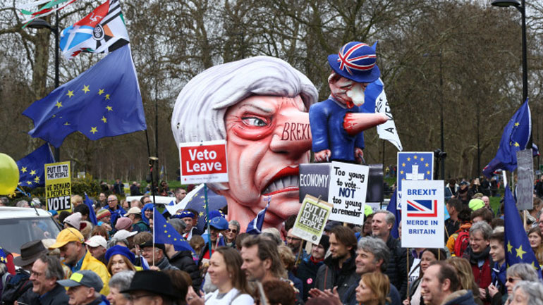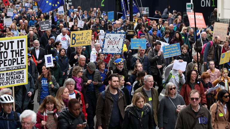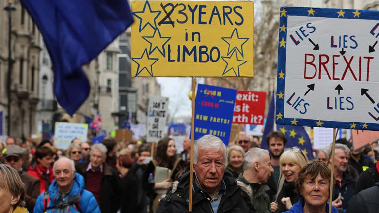 Εκατοντάδες χιλιάδες Βρετανοί συγκεντρώθηκαν το Σάββατο στο κέντρο του Λονδίνου ζητώντας να διεξαχθεί νέο δημοψήφισμα για το Brexit και πανηγύρισαν όταν έγινε γνωστό ότι η Βουλή των Κοινοτήτων ψήφισε υπέρ της αναβολής της αποχώρησης της Βρετανίας από την Ευρωπαϊκή Ένωση.