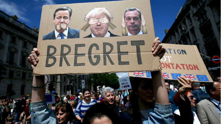 Σε κάποια από τα πλακάτ που κρατούσαν, συνέκριναν το Brexit με την εκλογή του Ντόναλντ Τραμπ στην προεδρία των ΗΠΑ. Ορισμένοι φορούσαν παράξενες στολές – ένας μάλιστα είχε ντυθεί μπανάνα και κρατούσε ένα πλακάτ με το σύνθημα «Είμαστε ώριμοι για αλλαγή».