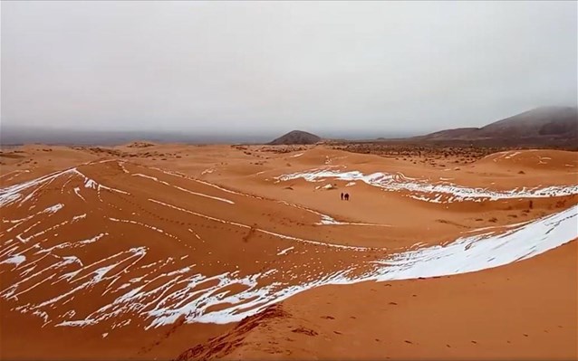 Για τρίτη φορά τα τελευταία 40 χρόνια σημειώθηκε χιονόπτωση στη Σαχάρα, καλύπτοντας τους αμμόλοφους κοντά στην πόλη Αΐν Σέφρα της Αλγερίας με αρκετά εκατοστά χιονιού, την περασμένη Κυριακή. Η άνοδος της θερμοκρασίας αργότερα μέσα στην ημέρα έλιωσε το χιόνι στην πόλη που είναι γνωστή ως η «Πύλη της Σαχάρα», ενώ η χιονοθύελλα χτύπησε και άλλα μέρη της δυτικής Αλγερίας και του Μαρόκο.