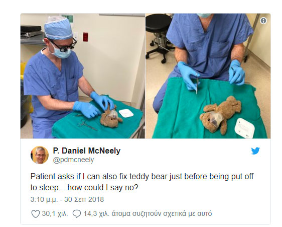 “Πως θα μπορούσα να πω όχι?” πόσταρε ο δρ. McNeely στο twitter μαζί με φωτογραφίες της… επέμβασης στο αρκουδάκι. Όπως ήταν φυσικό, το twitter… κατέρρευσε από τα likes και τα retweets που ξεπέρασαν τα 26.000 και 12.000 αντίστοιχα.