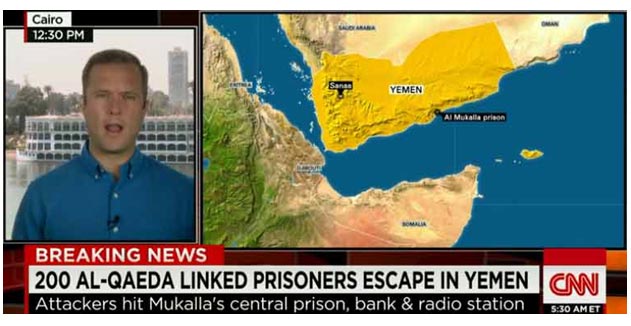 Τοπικοί αξιωματούχοι στην παραλιακή πόλη αλ- Μουκάλα της Υεμένης δήλωσαν στο CNN, ότι μαχητές της αλ-Κάιντα επιτέθηκαν εναντίον των τοπικών φυλακών νωρίς το πρωί και απελευθέρωσαν τουλάχιστον 270 φυλακισμένους το ένα τρίτο από τους οποίους ήταν μέλη της οργάνωσης.