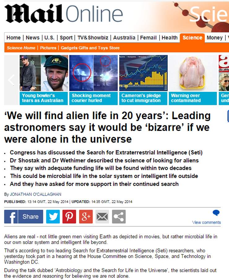 Ο Διευθυντής του προγράμματος SETI για αναζήτηση νοήμονος ζωής στο σύμπαν (SETI: Search for Extra-Terrestrial Intelligence) του Πανεπιστημίου της Καλιφόρνια, Δρ Dan Werthimer, καθώς και ο γνωστός αστρονόμος του SETI Δρ Seth Shostak τον Μάιο του 2014 δήλωσαν ενώπιον της Επιτροπής για την Επιστήμη, το Διάστημα και την Τεχνολογία του Αμερικανικού Κογκρέσου, ότι «θα ήταν πολύ παράξενο εάν ήμασταν μόνοι στο σύμπαν».