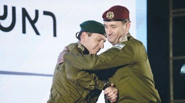 Ο τότε αρχηγός του επιτελείου των ισραηλινών ενόπλων δυνάμεων, Χέρζι Χαλεβί, αγκαλιάζει τον Ααρόν Χαλίβα, τον απερχόμενο επικεφαλής της Διεύθυνσης Στρατιωτικών Πληροφοριών, σε μια τελετή κατά την οποία ο Χαλίβα παραιτήθηκε πέρυσι. Το κοινό απαιτεί να μάθει πώς μπόρεσε να συμβεί η καταστροφή της 7ης Οκτωβρίου. ( πίστωση φωτογραφίας : TOMER NEUBERG/FLASH90)