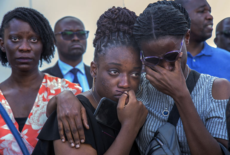 Σφίγγοντας το ένα τα χέρια του άλλου, ορισμένα αγκαλιασμένα, κάποια με δάκρυα στα μάτια, μέλη της οικογένειας, ανάμεσά τους οι γονείς και αδελφός του θύματος, περίμεναν τη σορό. Συνοδεύονταν από εκκλησιαστική χορωδία. Συγγενείς και μέλη της χορωδίας τραγουδούσαν θρησκευτικούς ύμνους.