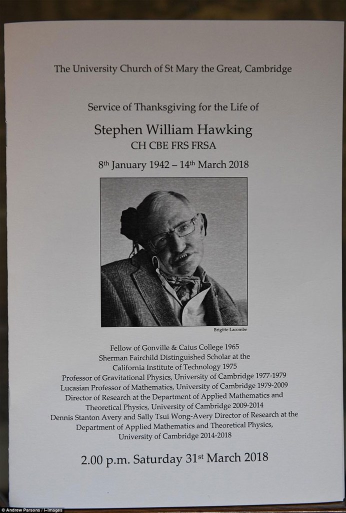 Η κηδεία του Χόκινγκ, πεπεισμένου άθεου ο οποίος πέθανε στις 14 Μαρτίου σε ηλικία 76 ετών, ξεκίνησε στις 14.00 (τοπική ώρα 16.00 ώρα Ελλάδας) στην εκκλησία St Mary the Great στο πανεπιστήμιο του Κέμπριτζ, όπου εργάστηκε επί περισσότερα από 50 χρόνια.