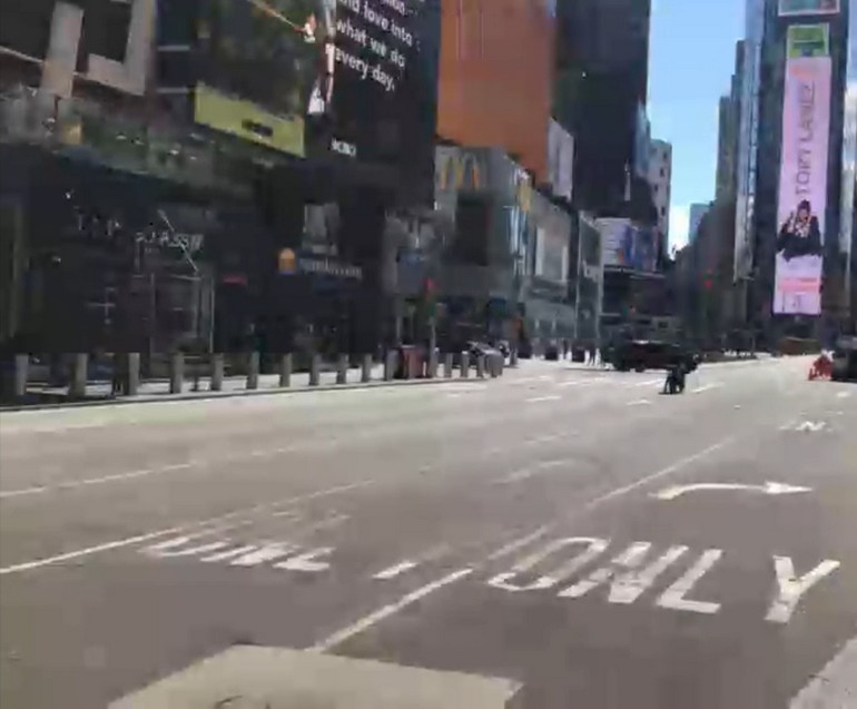 Τα θέατρα του φημισμένου Broadway, τα εκατοντάδες καταστήματα και οι κλασικές ηλεκτρονικές πινακίδες, μοιάζουν παράταιρα στην σχεδόν άδεια πόλη, που μέχρι πρότινος «δεν κοιμόταν ποτέ».