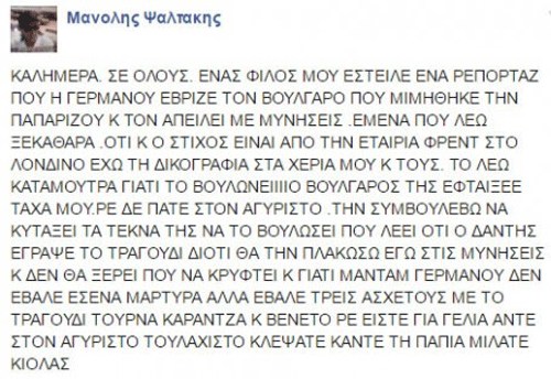 Ένα πολύ επιθετικό μήνυμα στον προσωπικό του λογαριασμό στο facebook σε βάρος της Ναταλίας Γερμανού έγραψε ο γνωστός στιχουργός Μανώλης Ψαλτάκης. Με αφορμή τις δηλώσεις της παρουσιάστριας για την εκτέλεση του «My Number One» από Βούλγαρο καλλιτέχνη, ο ίδιος αναβίωσε την κόντρα που είχε ξεσπάσει με αφορμή το συγκεκριμένο τραγούδι τη χρονιά που αυτό έφερε την πρωτιά στην Ελλάδα στον διαγωνισμό της Eurovision. Ο στιχουργός, που τότε υποστήριζε πως το τραγούδι του το είχε κλέψει ο Χρήστος Δάντης, έγραψε: