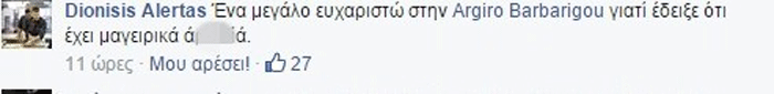 Λίγο αργότερα, ευχαρίστησε δημόσια την Αργυρώ Μπαρμπαρίγου, γράφοντας: «Ένα μεγάλο ευχαριστώ στην Αργυρώ Μπαρμπαρίγου γιατί έδειξε ότι έχει μαγειρικά αρχ@@ια».