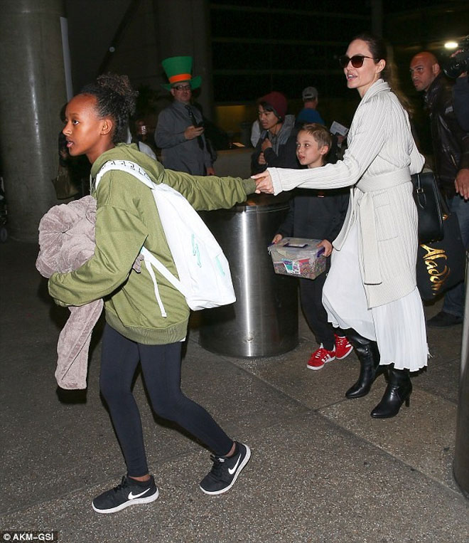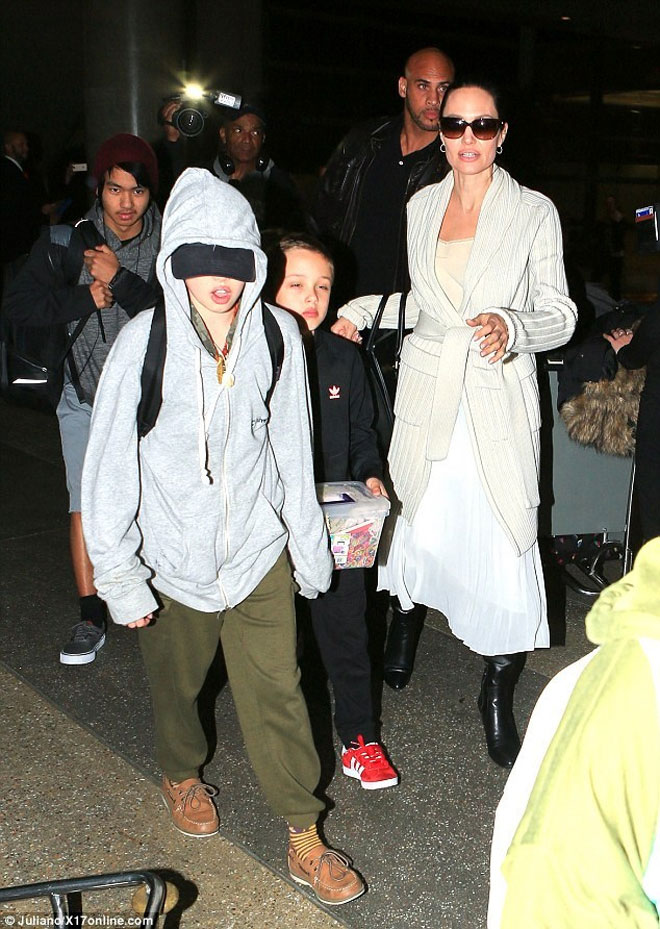 Την Παρασκευή ο φακός των παπαράτσι την απαθανάτισε στο αεροδρόμιο του LA μαζί με τα έξι παιδιά της, κατά την επιστροφή της από το Λονδίνο, όπου και μίλησε στην ετήσια διάλεξη του ΟΗΕ στον οργανισμό Sergio Vieira de Mello Foundation.