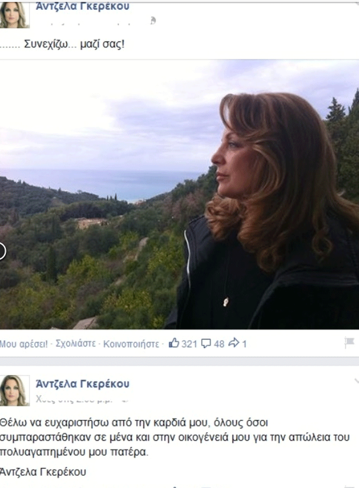 «Θέλω να ευχαριστήσω από την καρδιά μου, όλους όσοι συμπαραστάθηκαν σε μένα και στην οικογένειά μου για την απώλεια του πολυαγαπημένου μου πατέρα. Αντζελα Γκερέκου», έγραψε στη σελίδα της στο facebook, ενώ δημοσίευσε και μία μελαγχολική φωτογραφία ντυμένη στα μαύρα.