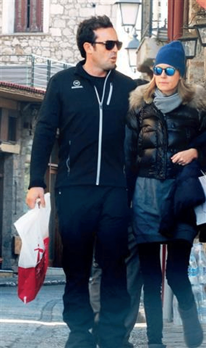 Στη φωτογραφία φαίνεται το ζευγάρι να προχωράει αγκαλιασμένο, στο κέντρο του θερέτρου, αμέσως μετά τις αγορές του σε κατάστημα με είδη εξοπλισμού σκι, οπού σύμφωνα με πληροφορίες ,η ίδια απέφυγε να κάνει σκι