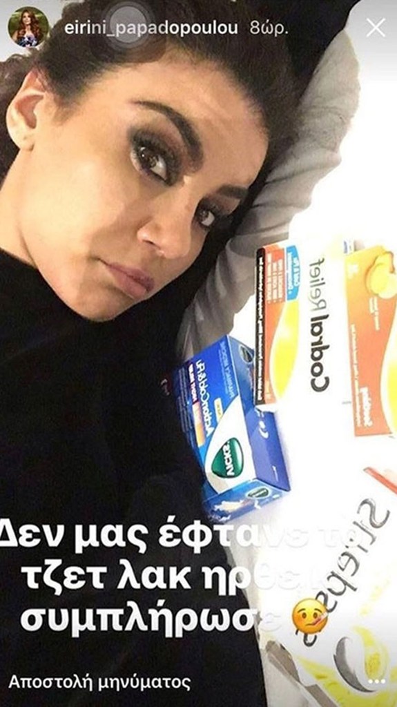 Η όμορφη τραγουδίστρια ανέβασε στα social media φωτογραφία της ξαπλωμένη, έχοντας τα φάρμακα αγκαλιά και αποκάλυψε ότι πέρασε και jet lag από μακρινό ταξίδι από το οποίο επέστρεψε. Η ίδια πάντως, δείχνει να το παλεύει ώστε να γίνει σύντομα καλά και να επιστρέψει στις επαγγελματικές της υποχρεώσεις.