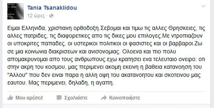 «Είμαι Ελληνίδα, χριστιανή ορθόδοξη. Σέβομαι και τιμώ τις άλλες θρησκείες, τις άλλες πατρίδες, τις διαφορετικές από τις δικές μου επιλογές. Με ντροπιάζουν οι υποκριτές παπάδες, οι υστερικοί πολιτικοί οι φασιστές και οι βάρβαροι. Ζω σε μια κοινωνία διακρίσεων και ανισονομίας.