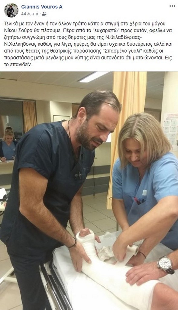 Ο ίδιος, έκανε γνωστή την είδηση μέσα από τον προσωπικό του λογαριασμό στο Facebook, δημοσιεύοντας μια φωτογραφία με το πόδι του στον γύψο ενώ το περιποιούνταν οι γιατροί, ανακοινώνοντας στη λεζάντα που την συνόδευε ότι η θεατρική παράσταση «Σπασμένο γυαλί» ολοκληρώνει πρόωρα τον κύκλο της.