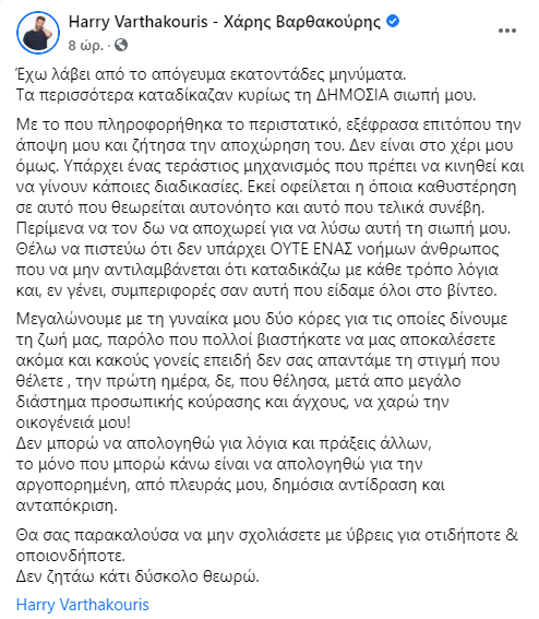»Μεγαλώνουμε με τη γυναίκα μου δύο κόρες για τις οποίες δίνουμε τη ζωή μας, παρόλο που πολλοί βιαστήκατε να μας αποκαλέσετε ακόμα και κακούς γονείς επειδή δεν σας απαντάμε τη στιγμή που θέλετε, την πρώτη ημέρα, δε, που θέλησα, μετά από μεγάλο διάστημα προσωπικής κούρασης και άγχους, να χαρώ την οικογένειά μου! Δεν μπορώ να απολογηθώ για λόγια και πράξεις άλλων, το μόνο που μπορώ κάνω είναι να απολογηθώ για την αργοπορημένη, από πλευράς μου, δημόσια αντίδραση και ανταπόκριση. Θα σας παρακαλούσα να μην σχολιάσετε με ύβρεις για οτιδήποτε & οποιονδήποτε. Δεν ζητάω κάτι δύσκολο θεωρώ».