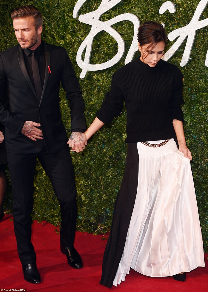 Φορώντας μια maxi ασπρόμαυρη φούστα «Victoria Beckham» αξίας 1.580 λιρών την οποία συνδύασε με μαύρο πουλόβερ από πάνω, δεν έκρυβε την χαρά της ποζάροντας στο κόκκινο χαλί, με τον 39χρονο Ντέιβιντ Μπέκαμ από δίπλα, να είναι ιδιαίτερα τρυφερός μαζί της.