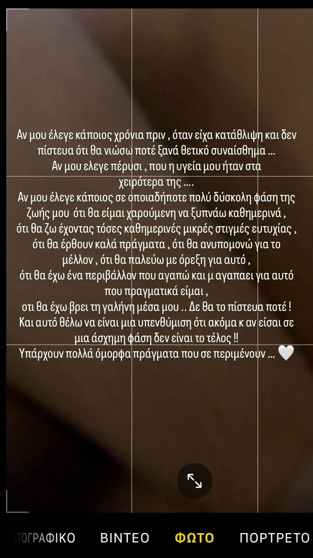 «Αν μου έλεγε κάποιος χρόνια πριν, όταν είχα κατάθλιψη και δεν πίστευα ότι θα νιώσω ποτέ ξανά θετικό συναίσθημα … Αν μου έλεγε πέρυσι, που η υγεία μου ήταν στα χειρότερά της … Αν μου έλεγε κάποιος σε οποιαδήποτε πολύ δύσκολη φάση της ζωής μου ότι θα είμαι χαρούμενη να ξυπνάω καθημερινά, ότι θα ζω έχοντας τόσες μικρές στιγμές ευτυχίας, ότι θα ανυπομονώ για το μέλλον, δεν θα το πίστευα ποτέ!»