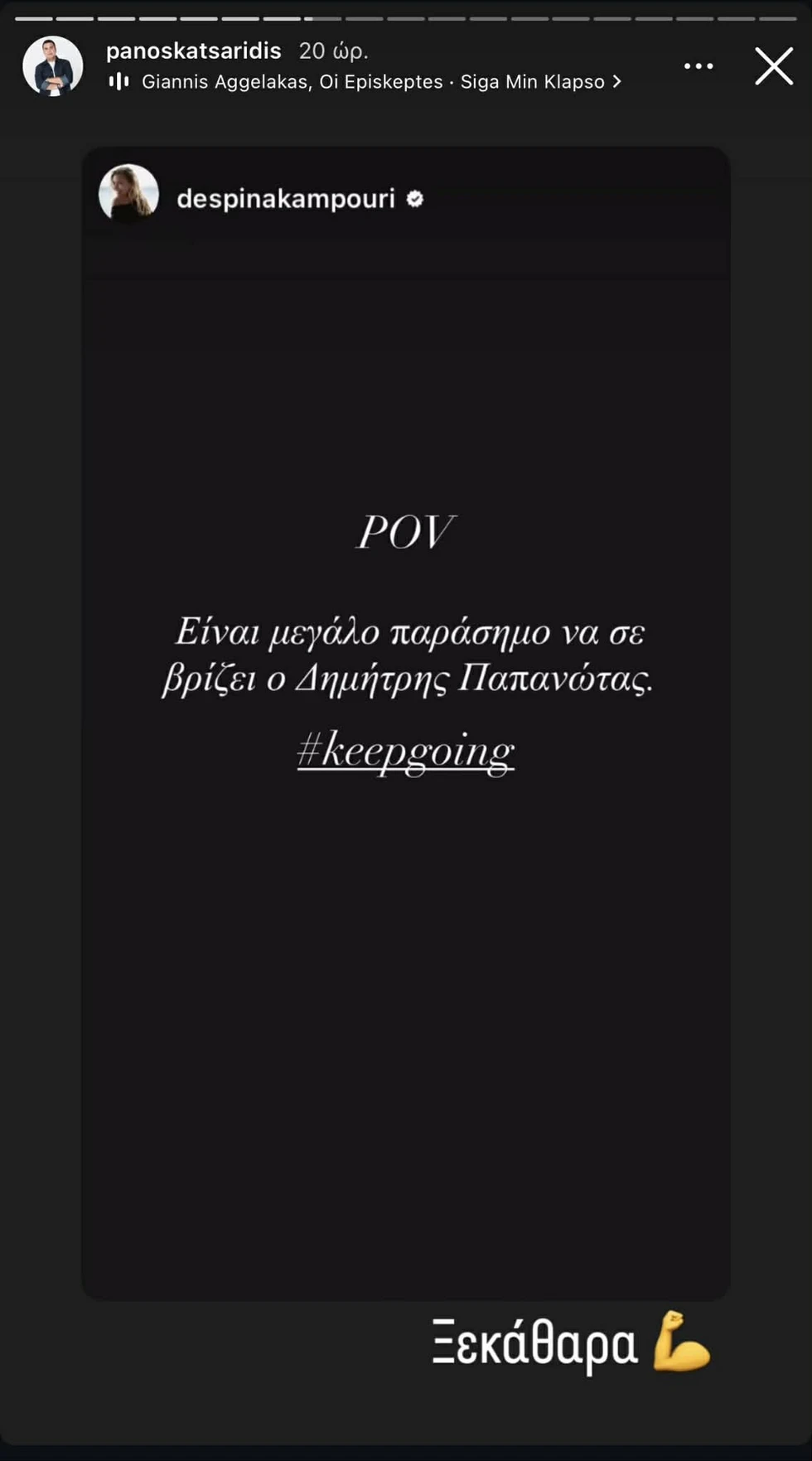 Λίγες ώρες αργότερα, η Δέσποινα Καμπούρη, έστειλε το δικό της μήνυμα, στον προσωπικό της λογαριασμό στο Instagram, λέγοντας χαρακτηριστικά: «Είναι μεγάλο παράσημο να σε βρίζει ο Δημήτρης Παπανώτας», φράση την οποία αναδημοσίευσε στον λογαριασμό του στο Instagram, ο Πάνος Κατσαρίδης, λέγοντας «Ξεκάθαρα».