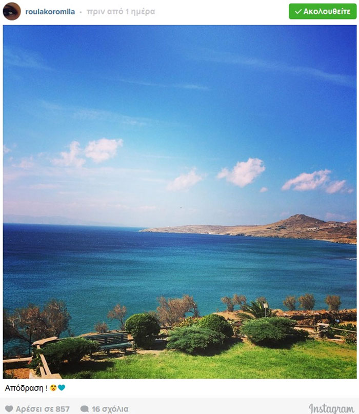 Η παρουσιάστρια αυτές τις μέρες χαλαρώνει στο νησί της Τήνου κι αν κρίνουμε απ’τις φωτογραφίες που ανεβάζει περνάει πολύ όμορφα, μακριά από την πρωτεύουσα.