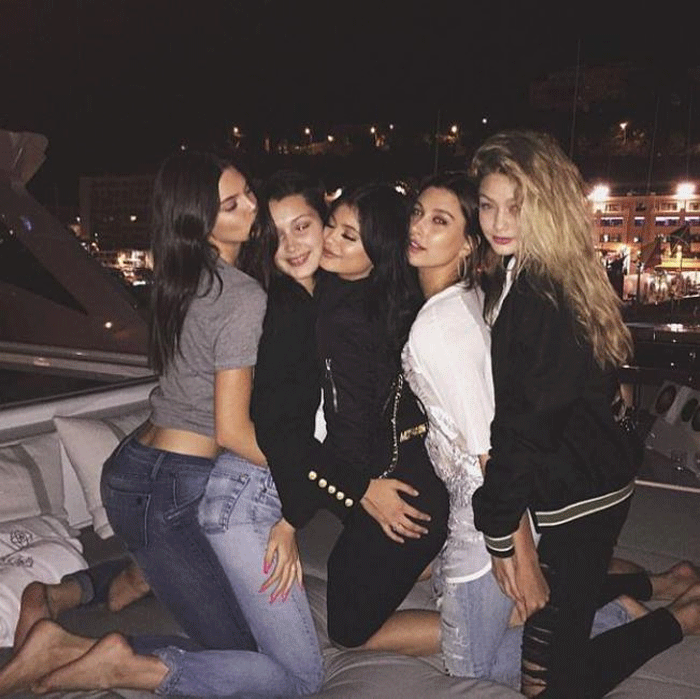 Σε μια άλλη φωτογραφία οι αδερφές Τζένερ και οι αδερφές Χαντίντ, μαζί με την κόρη της Κιμ Μπάσιντζερ και του Αλεκ Μπάλντουιν, Χέιλι, διασκεδάζουν με «ύποπτες» αγκαλιές και αγγίγματα.