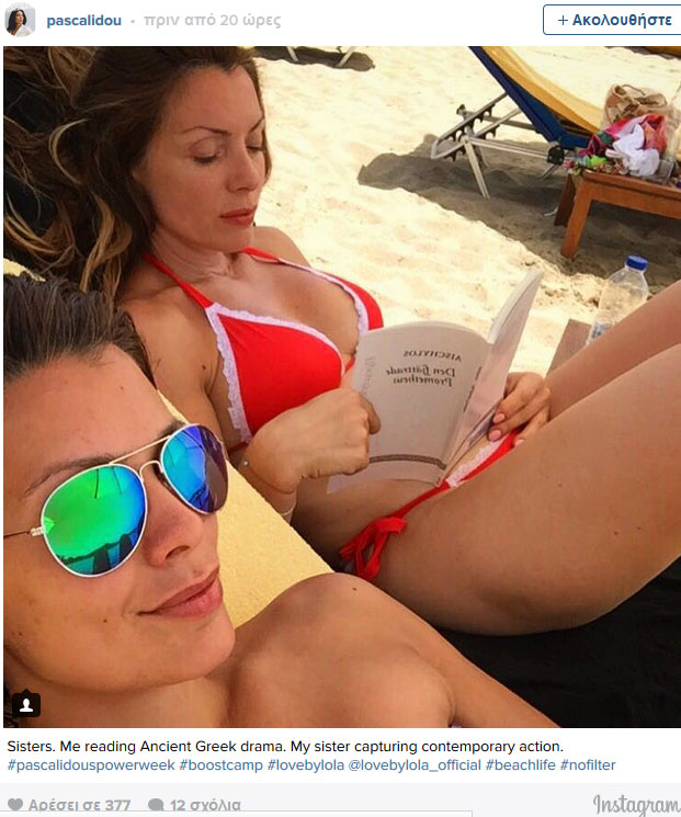 Συγκεκριμένα, βρέθηκε στην Ελούντα, μαζί με την αδελφή της Δήμητρα και ανέβασε στον λογαριασμό της στο Instagram ένα στιγμιότυπο από την παραλία όπου έκαναν ηλιοθεραπεία. «Αδελφές. Εγώ διαβάζω αρχαίο δράμα κι εκείνη απαθανατίζει μια σύγχρονη στιγμή» σχολίασε…