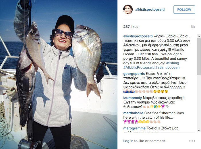 «Ψάρια- ψάρια -ψάρια… πιάστηκε και μια τσιπούρα 3,30 κιλά στον Ατλαντικό… μια όμορφη ηλιόλουστη μέρα γεμάτη με φίλους και χαρές !!! Atlantic Ocean… Fish fish fish… We caught a porgy 3,30 kilos. A beautiful and sunny day full of friends and joy» έγραψε η τραγουδίστρια.