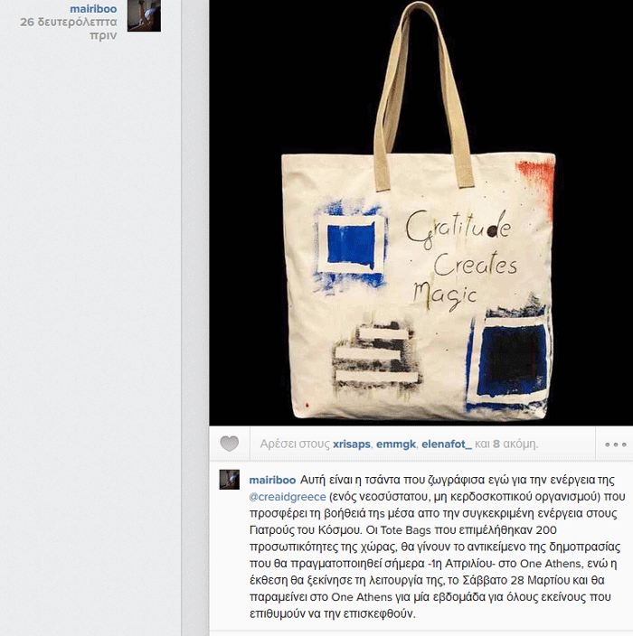 «Αυτή είναι η τσάντα που ζωγράφισα εγώ για την ενέργεια της creaidgreece (ενός νεοσύστατου, μη κερδοσκοπικού οργανισμού) που προσφέρει τη βοήθεθά της μέσα από τη συγκεκριμένη ενέργεια στους Γιατρούς του Κόσμου. Οι Tote Bags που επιμελήθηξαν 200 προσωπικότητες της χώρας, θα γίνουν το αντικείμενο της δημοπρασία που θα πραγματοποιηθεί σήμερα- 1η Απριλίου- στο One Athens ενώ η έκθεση θα ξεκινήσει τη λειτουργία της το Σάββατο 28 Μαρτίου και θα παραμείνει στο One Athens για μία εβδομάδα για όλους εκείνους που θα επιθυμούν να την επισκεφθούν» έγραψε χαρακτηριστικά η παρουσιάστρια.