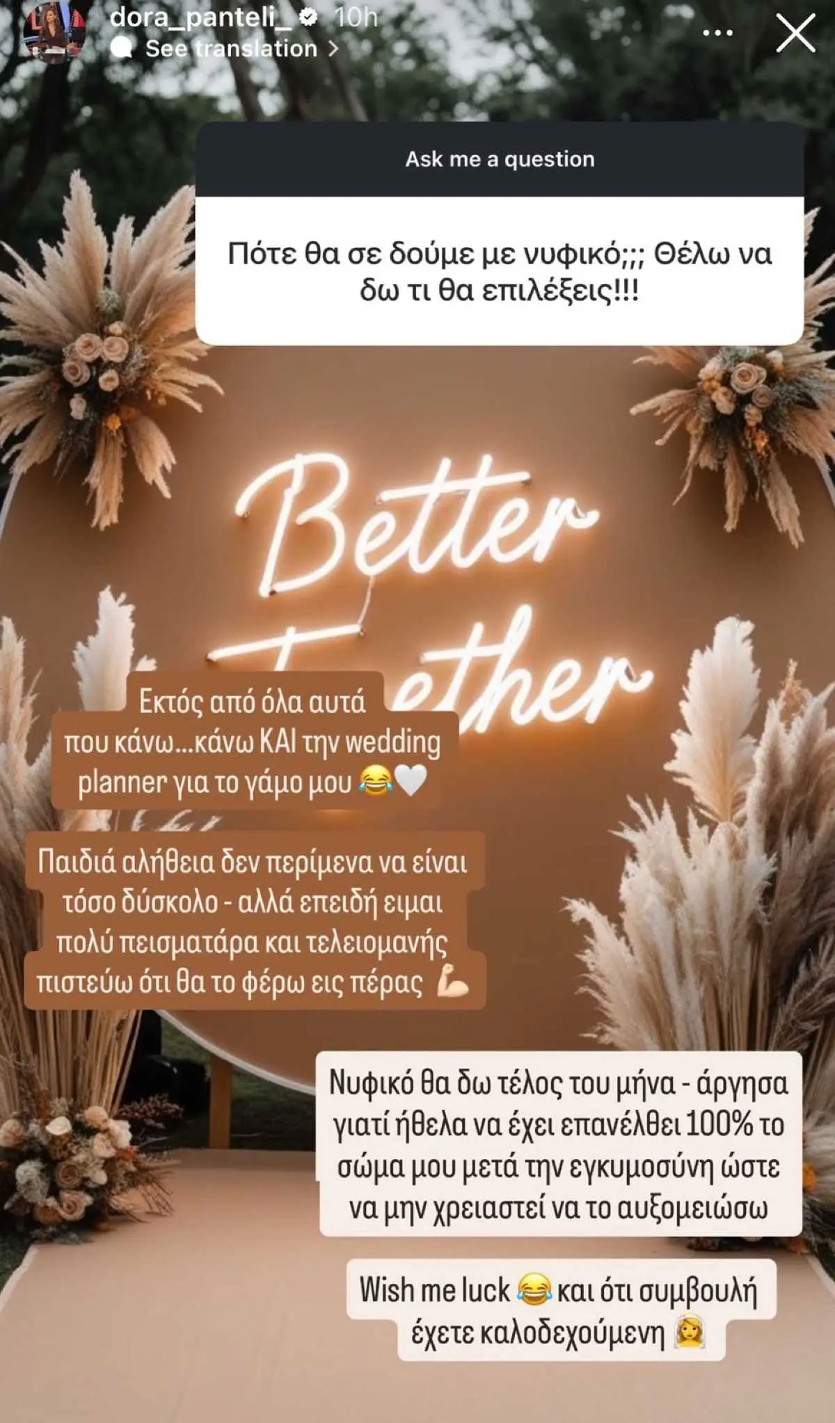 Παράλληλα, η αθλητικογράφος τόνισε με χιούμορ ότι αναλαμβάνει και τον ρόλο της wedding planner: «Δεν περίμενα να είναι τόσο δύσκολο – αλλά επειδή είμαι πεισματάρα και τελειομανής, πιστεύω ότι θα τα καταφέρω».