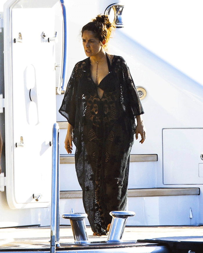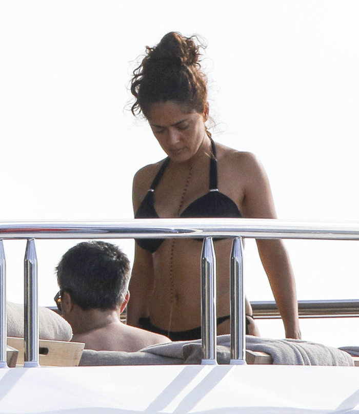 Η Σάλμα Χάγιεκ κάνει διακοπές στο Σεν Μπαθ με το σύζυγό της, Φρανσουά Ανρί Πινό και την κόρη τους, Βαλεντίνα. Η Χάγιεκ, φορώντας το μαύρο μπικίνι της έκοψε ανάσες, κάνοντας ηλιοθεραπεία στο γιοτ της.