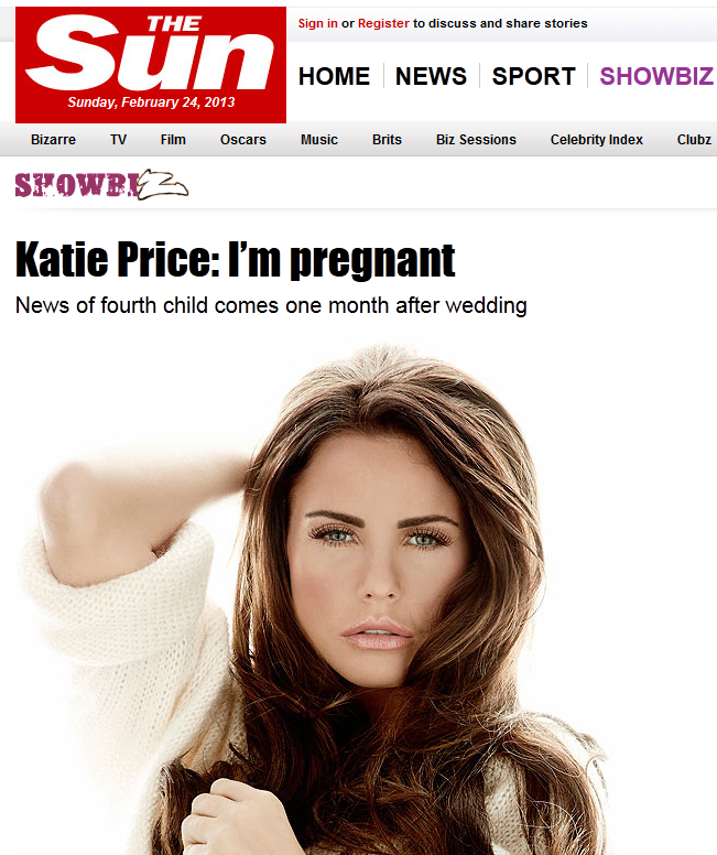 Μόλις πέντε εβδομάδες μετρά ο γάμος της με τον Kieran Hayler (σ.σ.: είναι ο τρίτος της σύζυγος), και η Katie Price αποκάλυψε ότι είναι έγκυος στην εβδομαδιαία στήλη της στην εφημερίδα «The Sun».